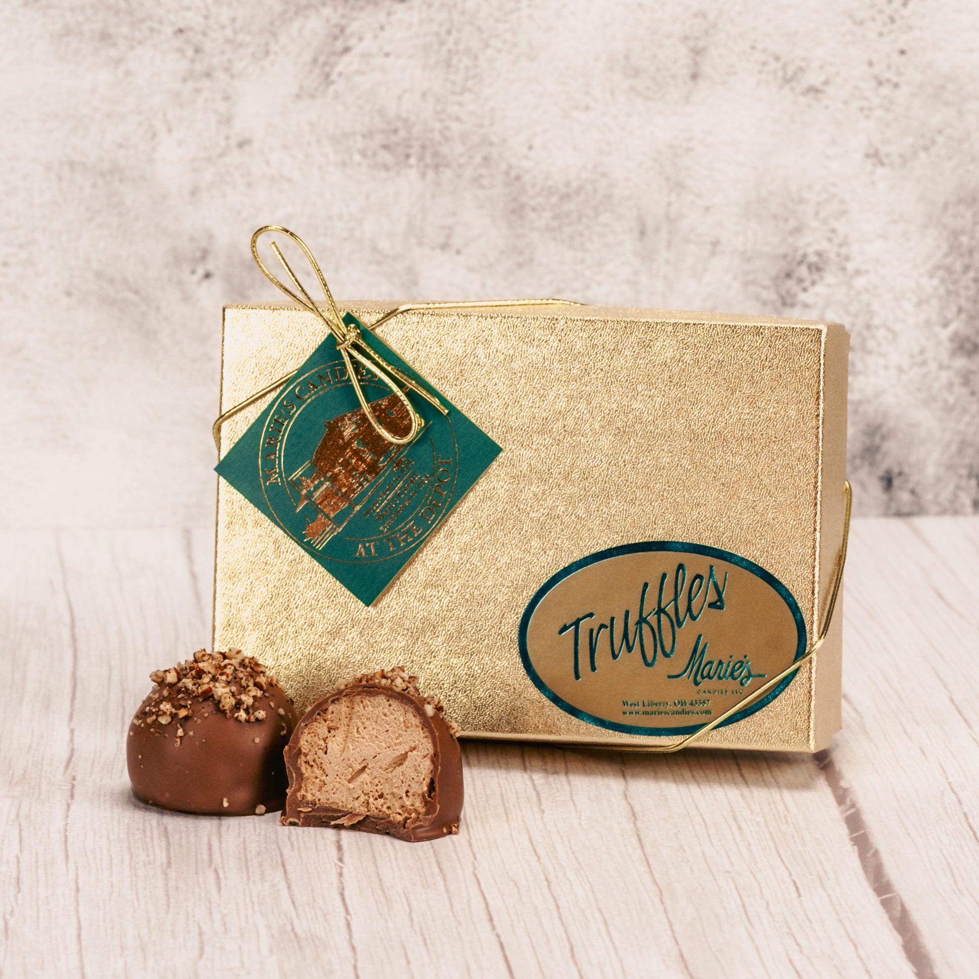 Thick cream, butter, and chocolate are whipped into a fluffy mousse and covered in creamy milk chocolate. They're available in two options: Chocolate with drizzle, or Chocolate with crushed pecans. We present them in our signature gold truffle box.